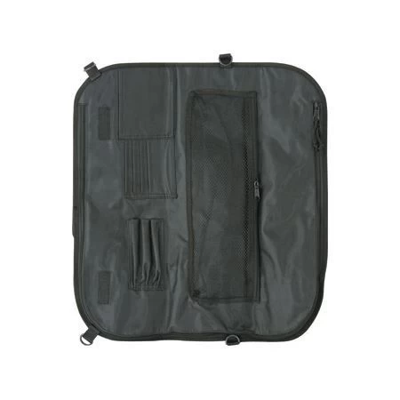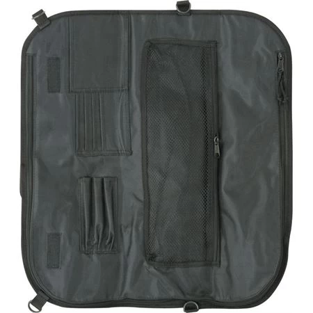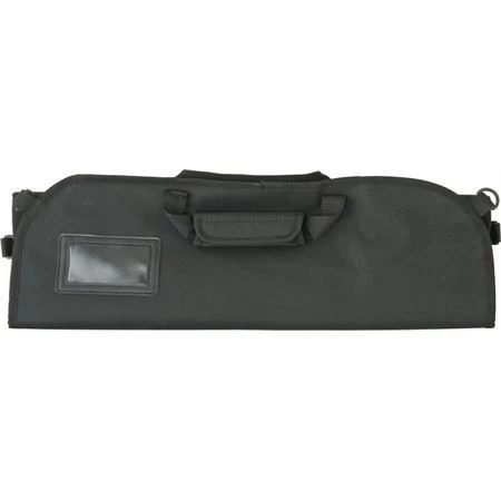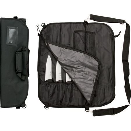 Model – AC142. AC 142 – Chef’s Knife Case with Carry Handle and Removable Shoulder Strap. Measures 20″ x 7″ rolled, 18″ x 20″ open. Center storage area holds 8 straight knives measuring up to 18″ overall, and features full zip closure. Interior features mesh zip pocket and various sleeves for pens, credit cards, etc. Folded case secures with velcro closure. Black nylon exterior with window for identification card. Carry handle and removable shoulder strap. Made in China.