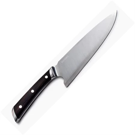 Model – BARE490. No 8 Chef’s Knife. 12.5 inch (31.75cm) overall. 8 inch (20.32cm) satin finish blade. 50CrMoV15 stainless blade. Black resin infused pakkawood handle. Brown leather sheath. Boxed. Made in China.