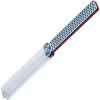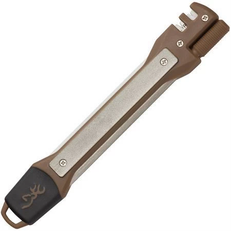 Model – BR0423B. Primal Knife Sharpener. Pocket sized. Diamond sharpening surface. Carbide and ceramic V-slot sharpening inserts. Ceramic touch-up rod with 20 degree angle guides. Removable diamond rod for serrated and guthook blades. Lanyard slot. Brown and black synthetic body. Boxed. Made in China