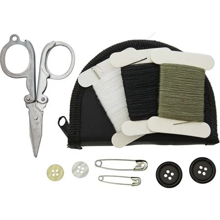 - Contains: (3) thread (white, black, green), (2) safety pins, (4) buttons, and scissors