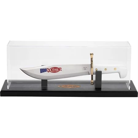Model – CA70635. Kodiak Hunter Magnetic Display. Stained White Walnut wood base with engraved Case logo and Plexiglass cover. Brass plate for engraving. Knife pictured not included. Base dimensions: 17 inch x 4.75 inch x 1 inch. Dome dimensions: 16.75 inch x 5.75 inch x 5.5 inch. Weight: 4 lbs. Boxed. Proudly made here in the USA.