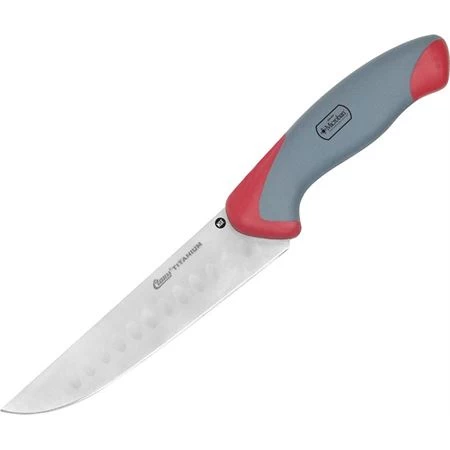 Model – CL18412. Titanium Chef’s Knife. 11.75 inch (29.85cm) overall. 6.5 inch (16.51cm) titanium coated stainless blade. Gray and red rubberized nylon handle. Microban treated handle. NSF approved. Hang packaged.