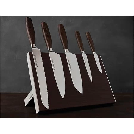 Model – FEL989106. FELIX Kitchen Set Magnetic Block. X50CrMoV15 stainless blade. Includes: Chef’s with 7″ blade; Bread with 8.5″ serrated blade; Carving with 8″ blade; Santoku with 6.5″ blade; Universal with 6″ blade. Smoked oak handle. Drop forged one piece construction. Veneered dark oak magnetic knife stand. Boxed. Made in Germany.