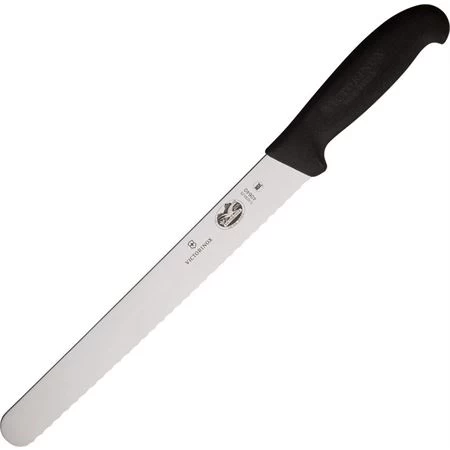 Model – VN5423325. Serrated Slicer. 10 inch stainless serrated blade. Black Fibrox handles.
