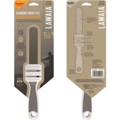 Model – AC50925. Lawaia Diamond Sharpener. 9.75 inch overall. Lanyard hole. Diamond hook file. Coarse and fine sharpening slots. White and gray soft grip TPE handle. Clam packed. Made in China.