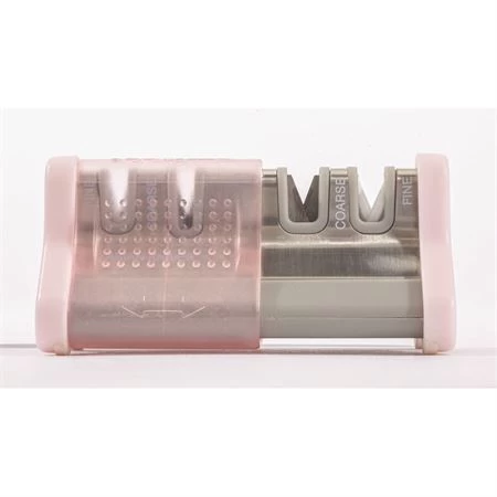 Model – AC51135. Slide Sharp 4 Sharpener Pink. 3.5 inch overall. Pink handle. Carbide blades and ceramic rods. Standard straight edge knives preset to 20 degrees. Asian straight edge knives preset to 15 degrees. Grips edge of counter. Clam packed. Made in China.