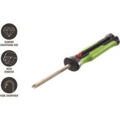 - 2.25″ diamond sharpening rod with hook sharpening groove and hook remover end