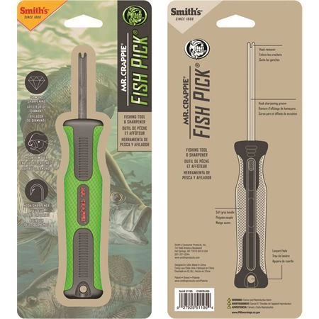 Model – AC51195. Mr. Crappie Fish Pick. Lanyard hole. 2.25 inch diamond sharpening rod with hook sharpening groove and hook remover end. Rod retracts into handle. Green and gray soft grip handle. Clam packed. Made in China
