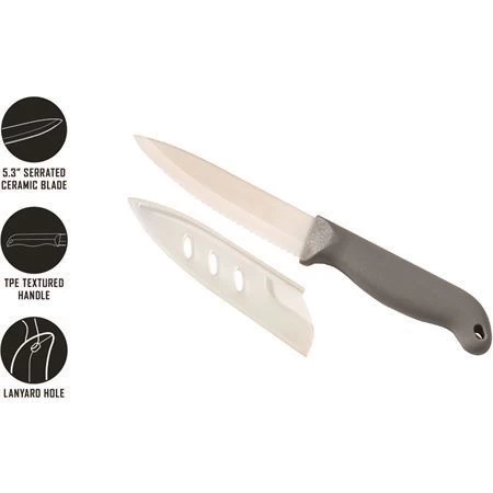 Model – AC51217. Lawaia Ceramic Fixed Blade. 9.25 inch (23.5cm) overall. 4.75 inch (12.07cm) white serrated ceramic blade. Gray TPE handle. Lanyard hole. Plastic blade guard. Bulk packed. Made in China.
