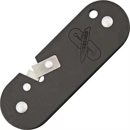 Model – STSBK. Sterling BK – Knife Sharpener with Black Lighweight Aluminum Body. The perfect pocket sized sharpening tool for knives and broad heads. Compact sharpener measures 3″ overall. Black lightweight aluminum body with lanyard hole. Easy to use. Weighs only 0.5 ounce. Bulk packed. From the field to the kitchen, the boat to the campsite, you cannot find a more easy to use sharpener. Within a few strokes your blade will be as sharp as new. For very dull knives more pressure and strokes may be required. No messy honing oils are required nor are there confusing multiple steps that many sharpeners have. Sterling is that easy. Made in U.S.A. Proudly made in the USA.