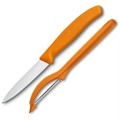 Model – VN760759X1. Victorinox 760759X1 – Pairing Knife/Peeler Combo. 7.5″ (19.05cm) overall. 3.25″ (8.26cm) satin finish stainless blade. Orange polymer handle. Dishwasher safe. 8.25″ overall peeler with potato eye remover and lanyard hole. Hang packaged. Made in Switzerland.